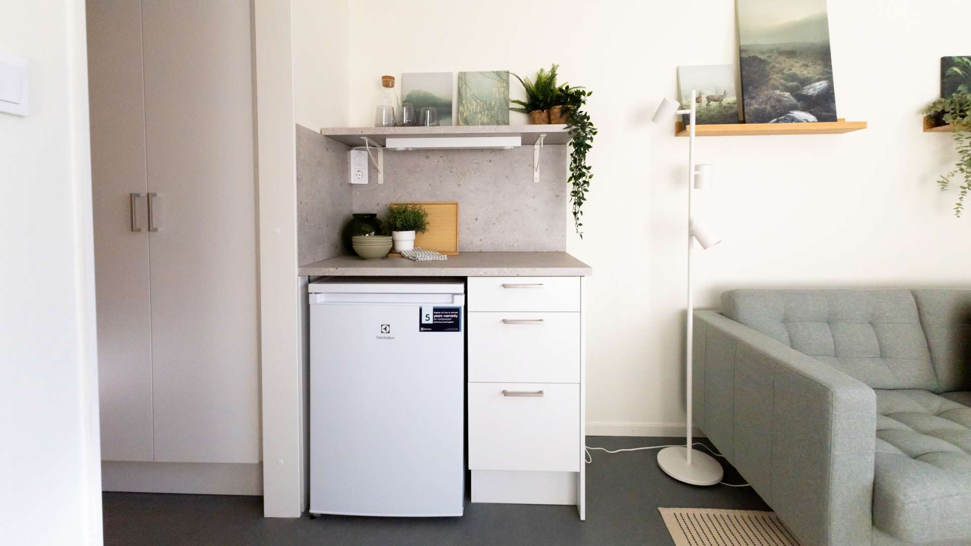 Rummen har också kompletterats med en ”köksdel” bestående av förvaring och kylskåp. Perfekt för dig som gillar att äta frukostmackan i fred 😊